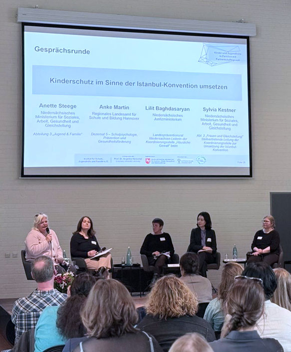 Seit August 2025 arbeiteten die Fortbildungsteilnehmenden der mehrteiligen Schulung von insgesamt vier dreitägigen Präsenzseminaren und zusätzlichen Selbstlernzeiten, Beratungs- und Coachinganteilen an eigenen Praxiselementen, die sie in der eigenen Region und niedersachsenweit umsetzen. Bei der Abschlusstagung am 17. April 2026 wurde eine breitere Fachöffentlichkeit sowie Vertreter:innen und Verantwortungsträger:innen aus Politik und Gesellschaft Niedersachsens für die Thematik sensibilisiert. Im Rahmen eines Impulsgesprächs "Kinderschutz im Sinne der Istanbul-Konvention umsetzen" wurden aktuelle Entwicklungen in Niedersachsen diskutiert. Anschließend wurden das Fortbildungskonzept und die Arbeit der Multiplikator:innen vorgestellt. Alle Praxiselemente und weitere Informationen zum Kurs und den Multiplikator:innen sind frei zugänglich in der Broschüre zu finden. Bei Unterstützungsbedarfen vor Ort können die Multiplikator:innen über ihre dort angegebenen Kontaktdaten oder über das Institut für Schule, Jugendhilfe und Familie e.V. kontakt@isjuf.de angefragt und kontaktiert werden.