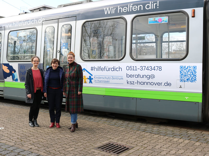 Das Kinderschutz-Zentrum Hannover in Trägerschaft des Kinderschutzbundes Niedersachsen hat im Rahmen seiner #hilfefürdich-Kampagne eine üstra-Stadtbahn bekleben lassen. Die umgestaltete Stadtbahn und die Kampagne haben am 30. März 2023 Dr. Anja Stiller, Leitung des Kinderschutz-Zentrums in Hannover, Staatssekretärin Dr. Christine Arbogast, Niedersächsisches Ministerium für Soziales, Arbeit, Gesundheit und Gleichstellung, und Denise Hain, üstra Arbeitsdirektorin und Vorständin für Betrieb und Personal, vorgestellt.